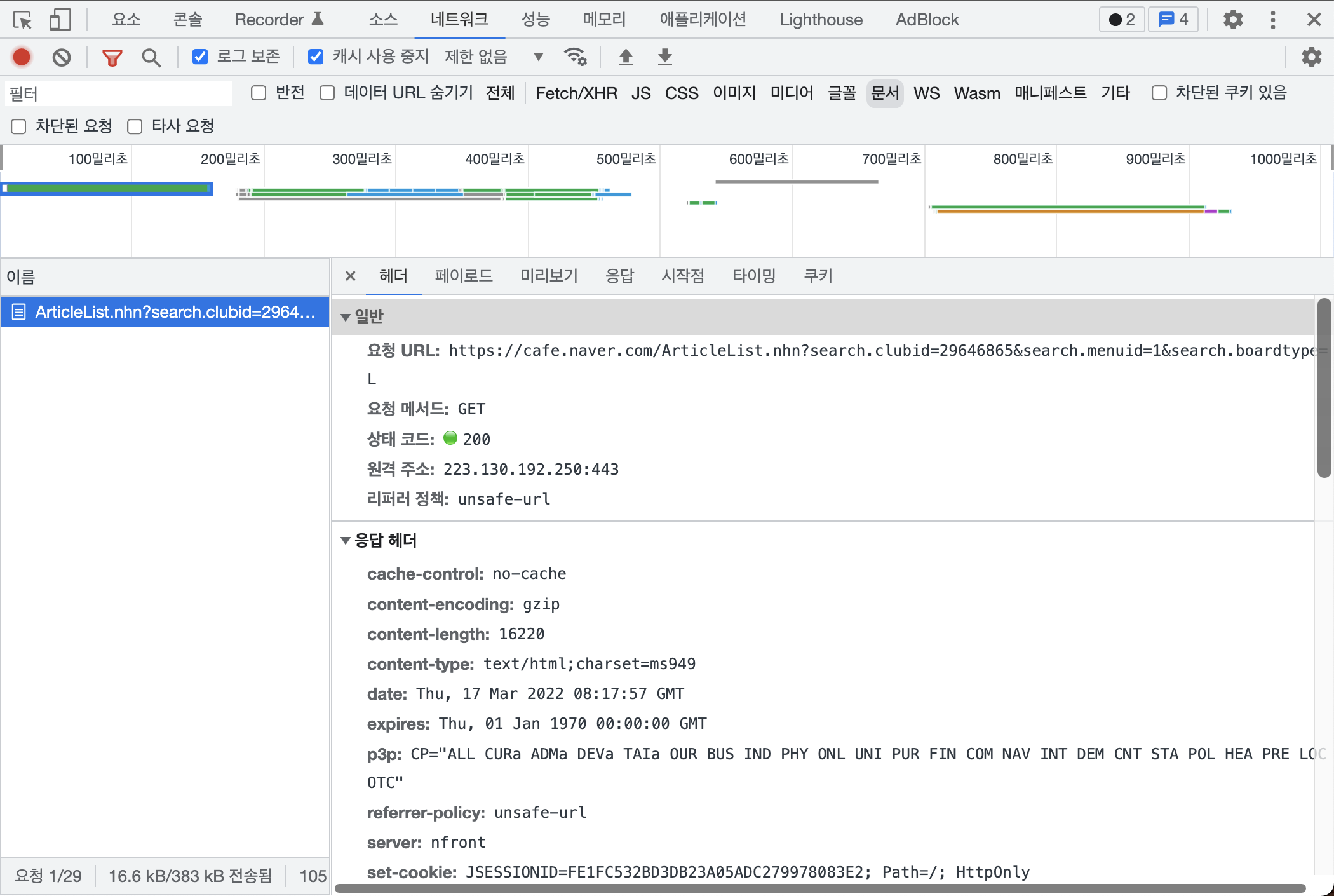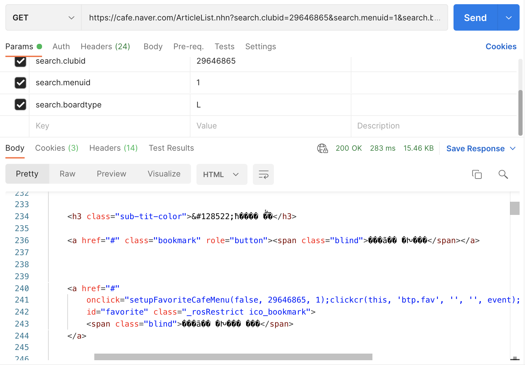 개발자 도구의 네트워크 탭에서 https://cafe.naver.com/ArticleList.nhn?search.clubid=29646865&userDisplay=30&search.boardtype=L&search.cafeId=29646865&search.page=1&search.menuid=1 로 문서를 불러오는 것을 확인했다. search.clubid로 카페를 구분하고 이외의 옵션으로는 몇 개의 글을 불러올 지를 결정하는 search.userDisplay, 게시글들을 보여주는 방식을 나타내는 search.boardtype, 앞의 clubid와 동일한 search.cafeId, 페이지네이션을 나타내는 search.page, 게시판 종류를 구분하는 search.menuid 등이 있었다. 그렇다면 search.clubid, search.userDisplay, search.boardtype, search.cafeId는 고정하고 페이지와 게시판 종류를 달리하여 요청하면 일반적인 게시판 기능을 구현할 수 있을 것이다. 그래서 테스트를 위해 postman을 활용해서 해당 url로 GET 요청을 보냈더니....