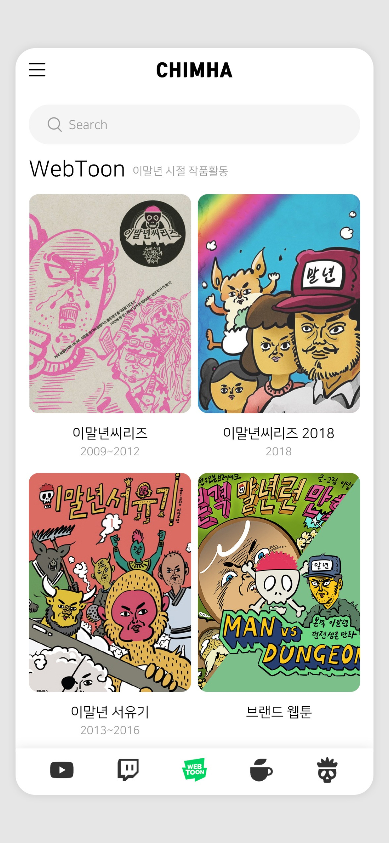 침착맨이 이말년 시절 연재하던 네이버 웹툰들을 보여준다. 클릭했을 때 네이버 웹툰 앱이 있다면 앱을 열고 해당 웹툰으로 이동한다. 제일 구현하기 쉽다고 생각했지만 의외의 곳에서 고전했는데 바로 네이버 웹툰의 Url Scheme(fb455753897775430://)은 알고 있지만 특정한 웹툰 ID로 이동할 수 있는 방법을 알아낼 수 없었던 것이다.