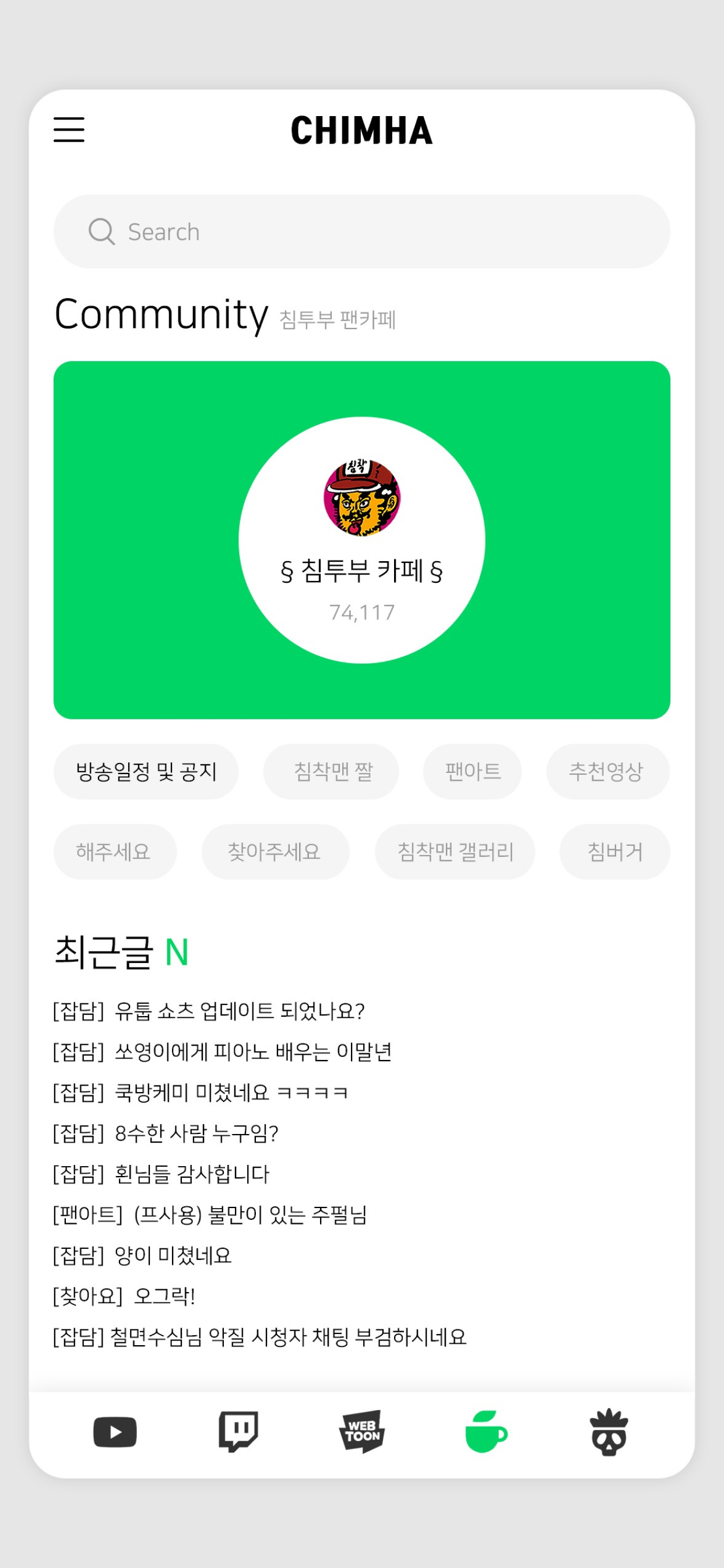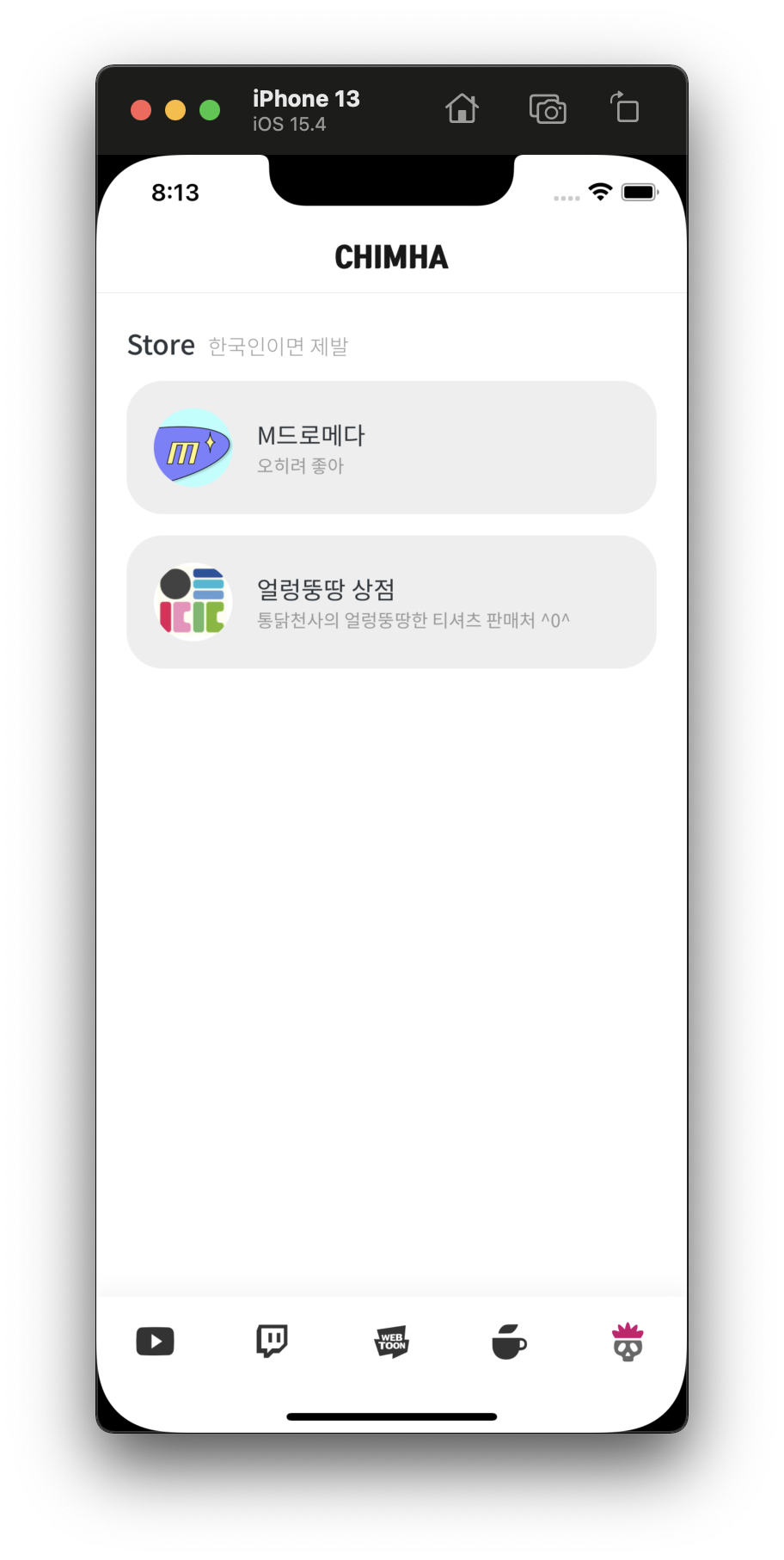 화면은 유튜브 화면, 트위치 화면, 웹툰 화면, 카페 화면, 스토어 화면으로 순서대로 구현했다.