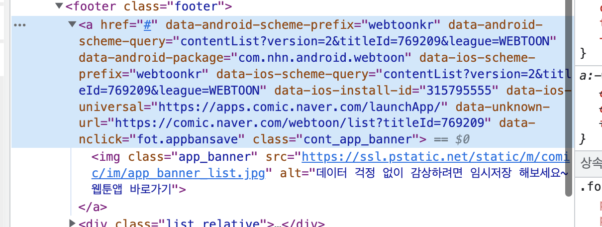 다음으로 data-ios-universal은 무엇인지 궁금했는데 https://developer.apple.com/ios/universal-links/ 를 참고해보니 Apple이 웹사이트를 거쳐 iOS 앱을 열 수 있게 하는 방식이라고 한다. 클릭했을 때는 data-ios-scheme-query가 뒤에 붙여져서 접속되었다. Deep Link로 https://apps.comic.naver.com/launchApp/contentList?version=2&titleId=704595&league=WEBTOON 를 해봤더니