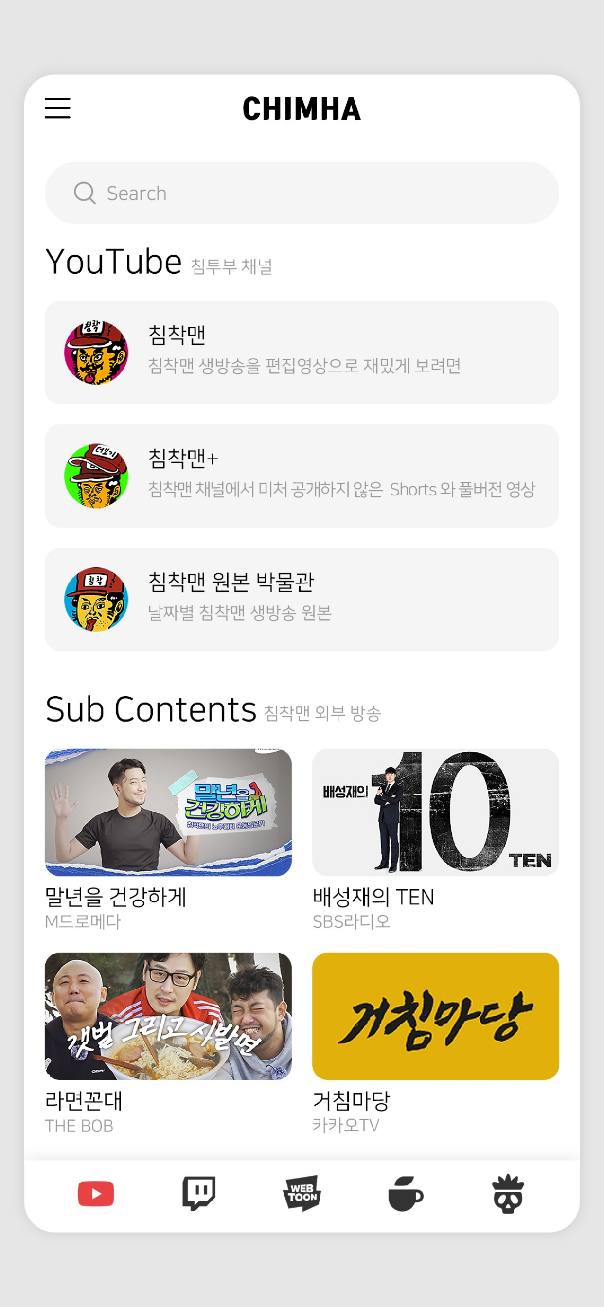 상단에 위치하게 되는 채널들은 이미 정해져있기 때문에 썸네일, 채널명, 채널 설명 등을 미리 저장해서 쓸 수 있었지만, 채널 id만을 저장해서 Youtube Data API에 그때그때 요청해서 불러오는 방식을 선택했다. 현재 침착맨 플러스라는 이름의 채널이 긴착맨, 짤착맨, 침착맨 더보기, 침착맨+ 로 변모해왔기 때문에...