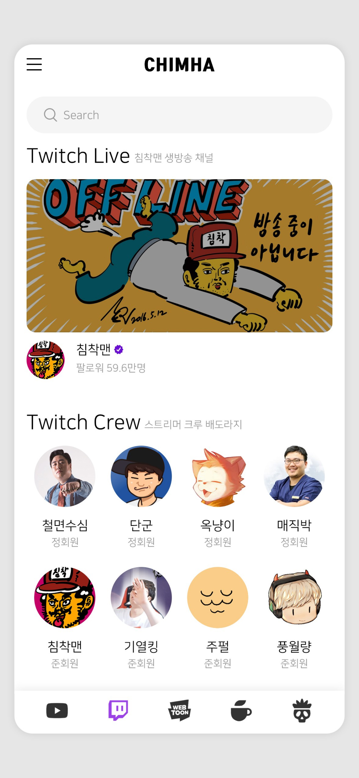 만약 현재 스트리밍 중이라면 방송 중인 화면이 이미지로 보여지고, 오프라인이라면 저 이미지를 보여준다. 클릭하면 침착맨 트위치 채널로 이동한다. 유튜브 화면과 비슷하게 ID를 저장하고 Twitch API를 사용해서 구현했다.